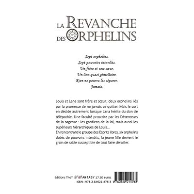 Sept orphelins. Sept pouvoirs interdits. Un frère et une s ur. Un lien quasi gémellaire. Rien ne pourra les séparer. Jamais. Louis et Lana sont frère et s ur ; deux orphelins liés par la promesse de ne jamais se quitter. Mais le sort en décide autrement lorsque Lana hérite du don de télépathie. Une faculté proscrite par les Détenteurs de la sagesse : les gardiens de la loi, mais aussi les supérieurs hiérarchiques de Louis... En rencontrant le groupe des Esprits libres, six orphelins dotés de pouvoirs interdits, la jeune fille devient le grain de sable susceptible de tout faire dérailler.
